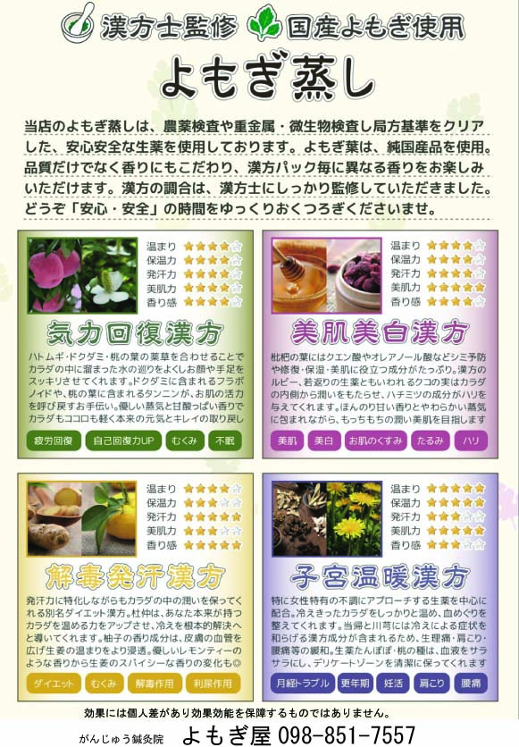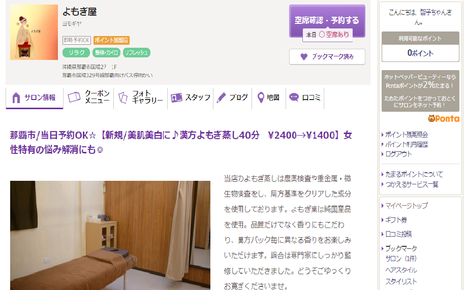 初めてでドキドキしながら伺ったのですが、丁寧な説明で安心してよもぎ蒸しに入ることができました。 お値段もすごくリーズナブルなので、これから定期的に通いたいと思います。(2020年1月13日来店)
